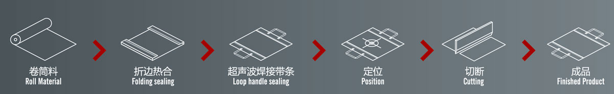 2.本機通過折邊后,再經過左右兩臺燙把機把雙手提條焊好,裁切出來。